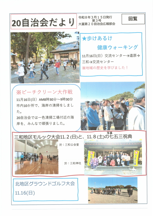 大富第20自治会は、防災・環境問題・交通安全・福祉関係・その他住民の方たちと情報を共有しています。